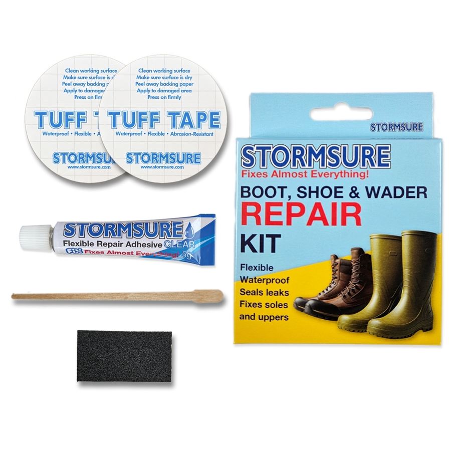 Tato sada kombinuje sílu flexibilního opravného lepidla Stormsure s praktickými záplatami Tuff Tape a brusným papírem a poskytuje tak vše potřebné k opravě netěsností, děr a trhlin v botách.